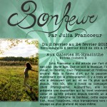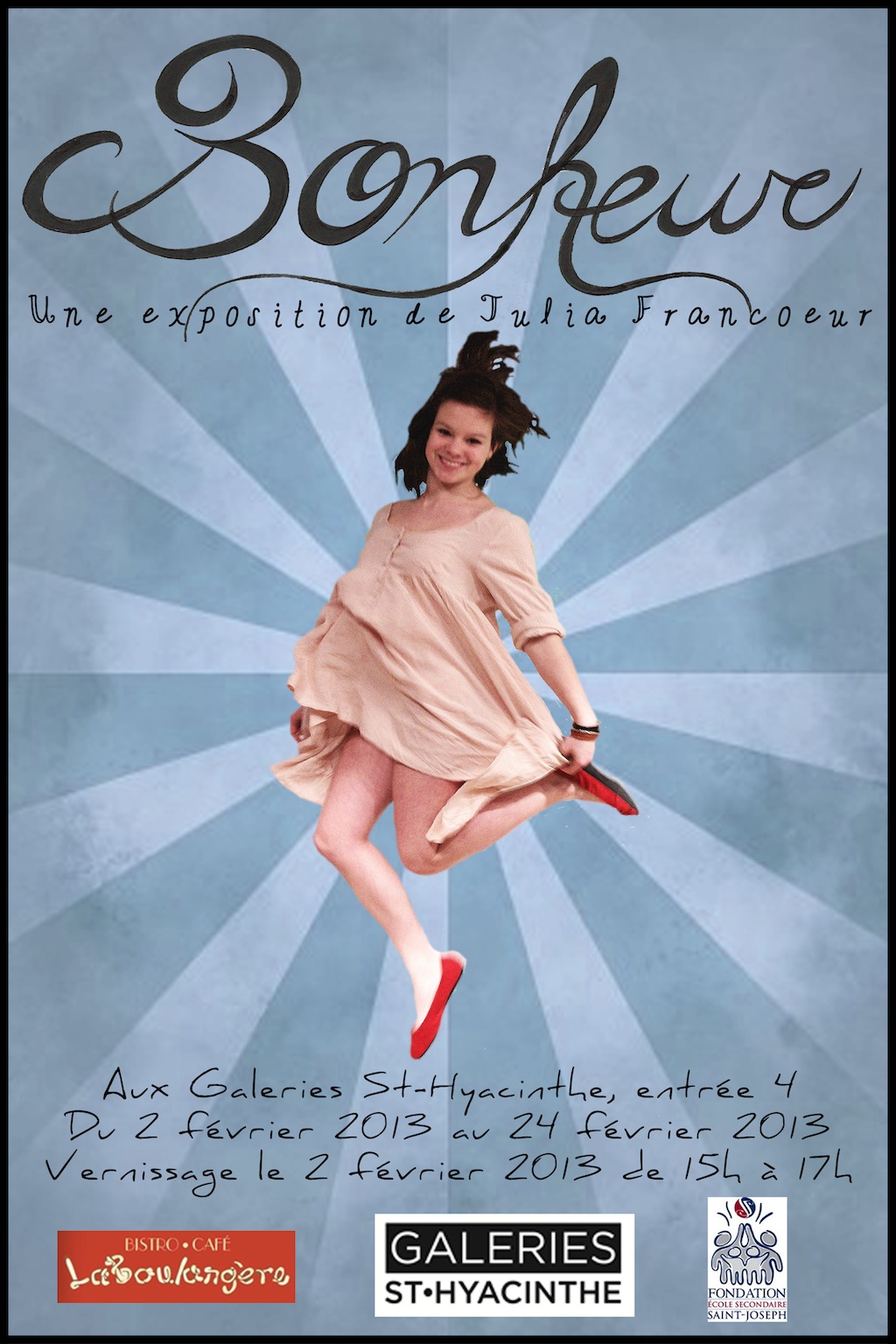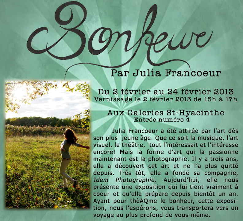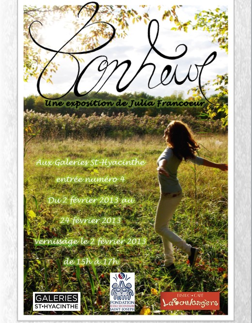 Dans le cadre de son projet personnel, Julia Francoeur, élève du groupe 57 au Programme d’Éducation Internationale, a organisé une exposition de photographie sur le thème très complexe du bonheur. Après près d’un an à travailler extrêmement fort sur ce projet, elle nous invite enfin à venir l’encourager le 2 février 2013 lors de son vernissage.