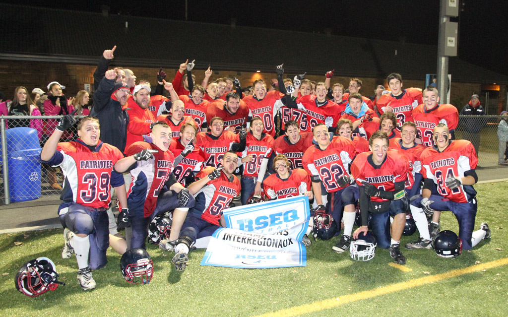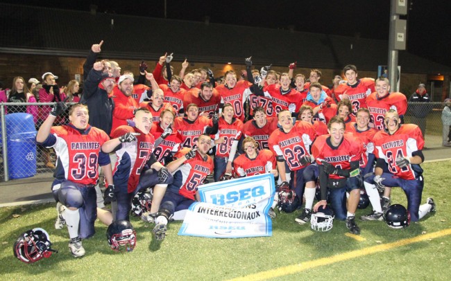C’est samedi dernier que se déroulait la finale inter-régionale de football juvénile division 2B au Cégep de St-Jean-sur-Richelieu. Nos Patriotes de l’ÉSSJ se mesuraient à l’Intrépides de l’École du Chêne-Bleu de la région du Lac-St-Louis. Ce fut une victoire convaincante des Patriotes par la marque de 34 à 7. Les Patriotes ont dominé littéralement, à la première demie le pointage était de 28 à 0. La domination s’est poursuivie au cours de la deuxième demie. Depuis l’existence du programme, c’est un deuxième Bol d’Or que nos Patriotes remportent. Félicitations à tous les joueurs, aux entraîneurs, aux physiothérapeutes et merci à tous les partisans présents.