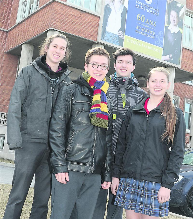 Philippe Vézina-Tardif, Félix Ledoux, Vincent Lessard et Ève St-Germain, de l’ÉSSJ, exerceront leur talent oratoire à la finale régionale du concours jeunesse Entreprendre. Photo François Larivière | Le Courrier ©