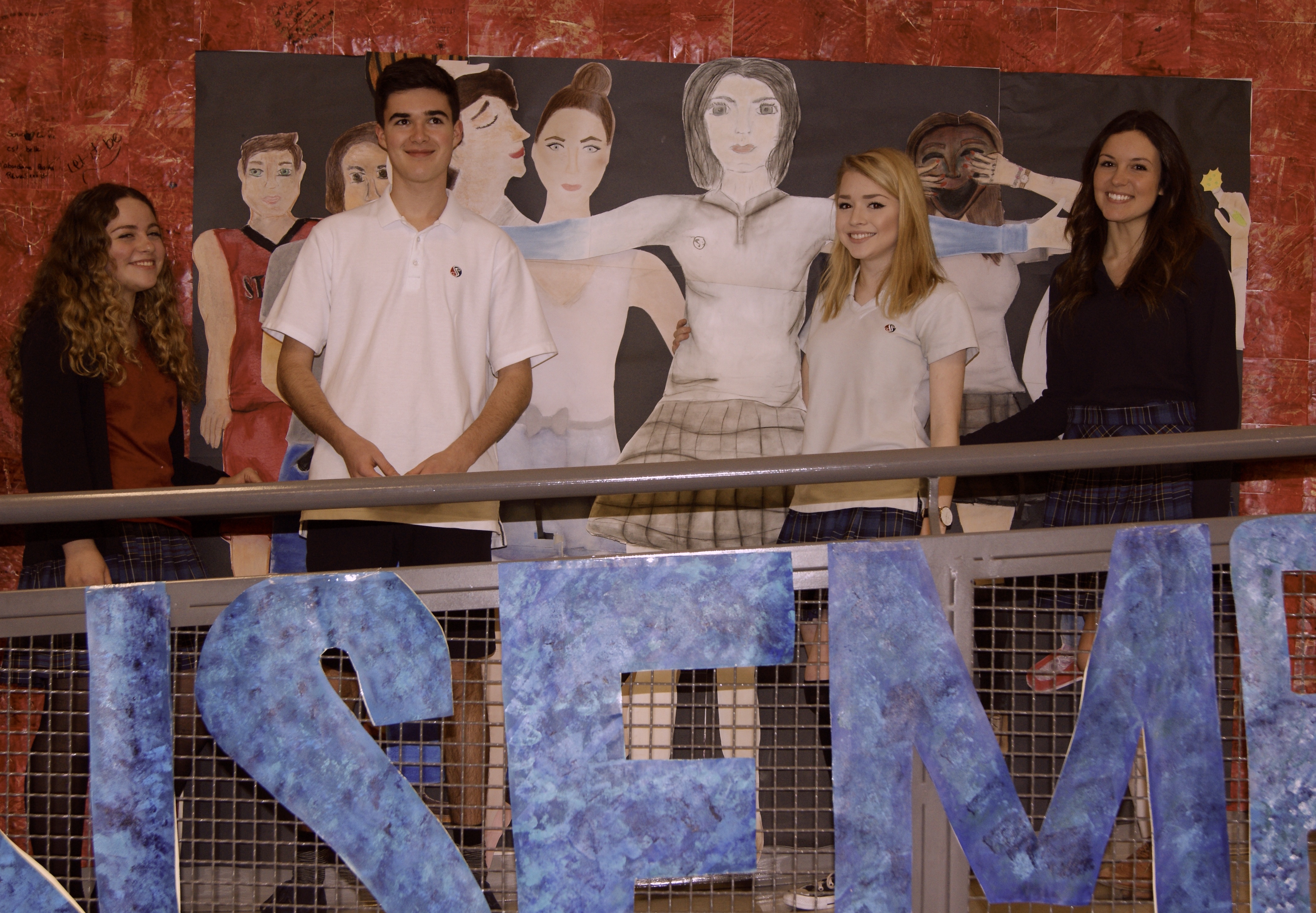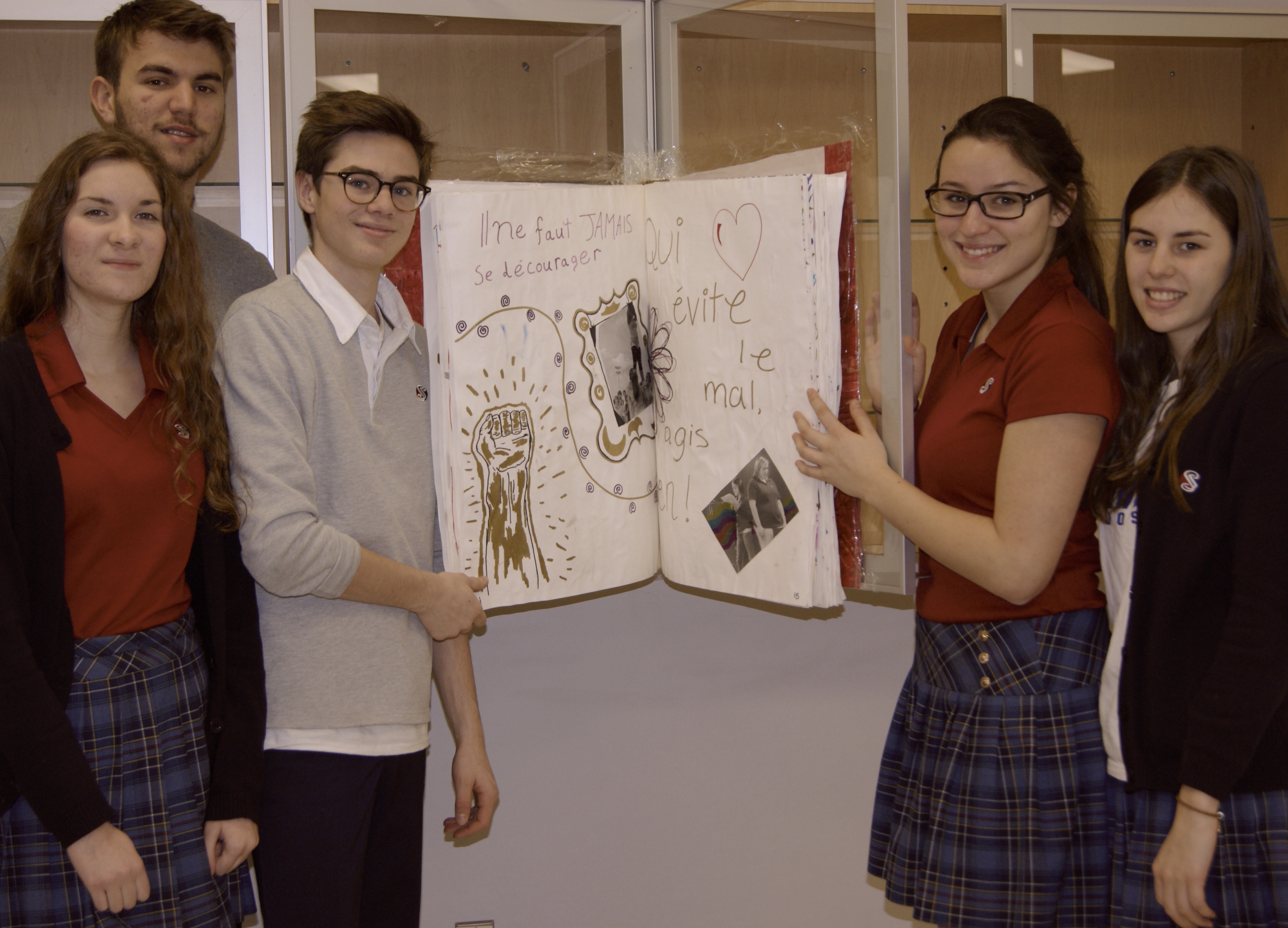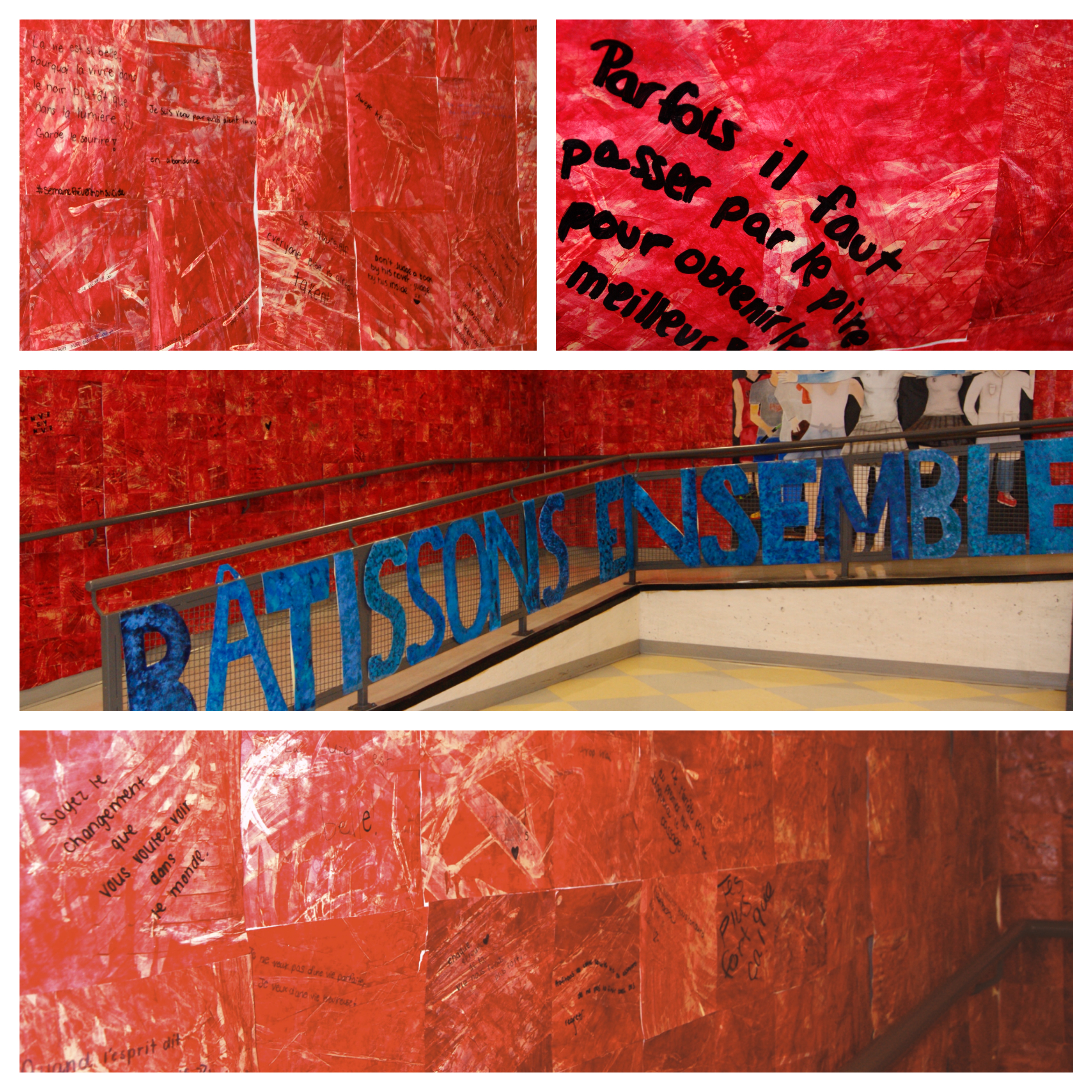 Dans un premier temps, les quatre classes d’arts plastiques de 4e secondaire ont peint de nombreuses tuiles sur lesquelles chaque élève de la 1re à la 5e secondaire a été invité à écrire une phrase de vie qui a du sens pour lui ou pour elle. Près de 1300 tuiles à messages et d’autres ont été rassemblées, agencées et collées par 14 élèves de 5e secondaire de l’option Arts visuels et multimédia.  Des dessins grandeur nature de personnes représentant des élèves ont été réalisés sur carton par quatre élèves de l’option. Une équipe de sept élèves s’est appliquée à concevoir et à fabriquer les lettres du thème en 3D. Pendant que neuf autres reprenaient certaines phrases, les illustrant, les complétant par du dessin et des photographies à l’intérieur de deux grands journaux créatifs qui sont devenus deux grands livres pour que jamais on n’oublie.