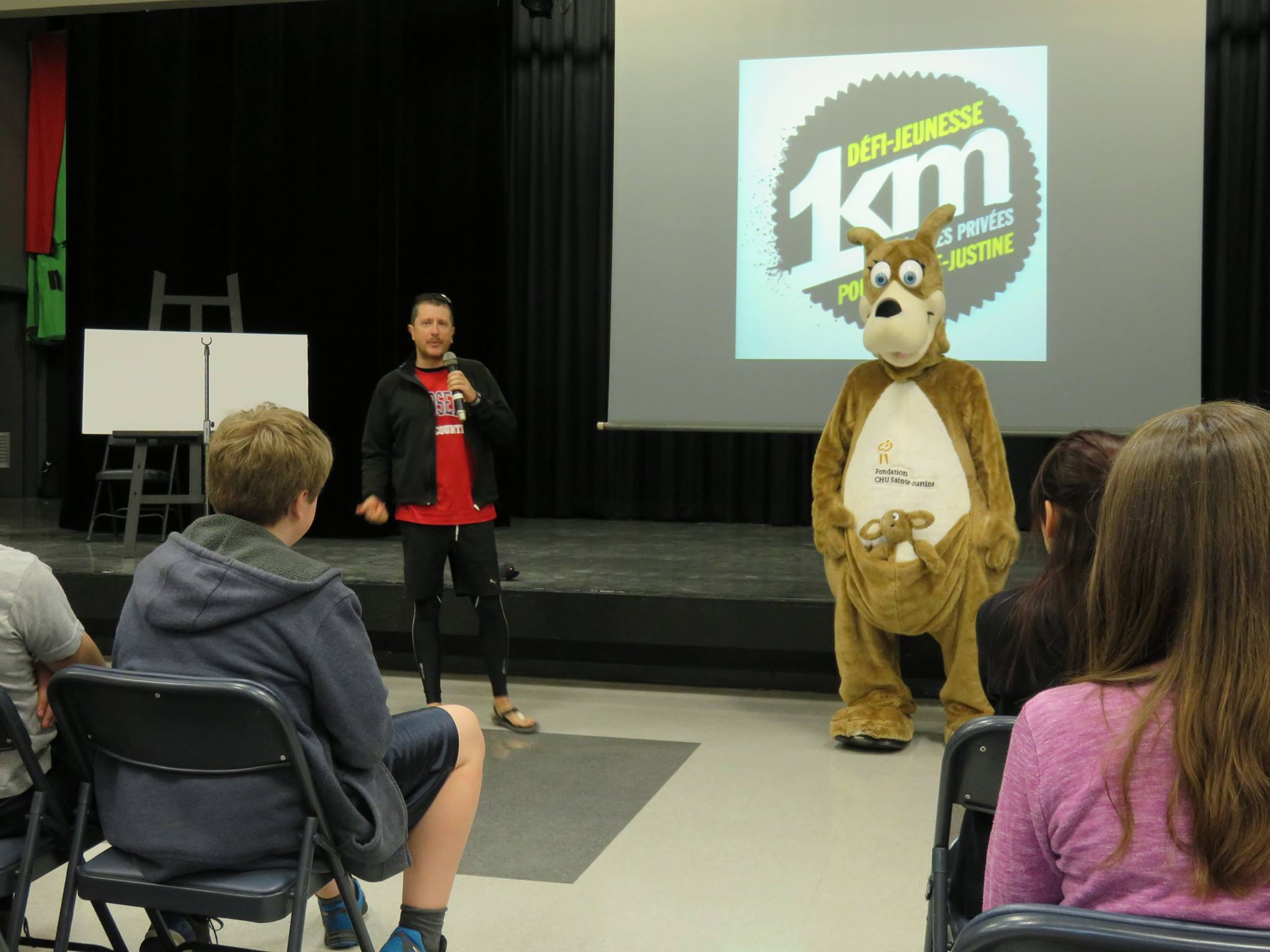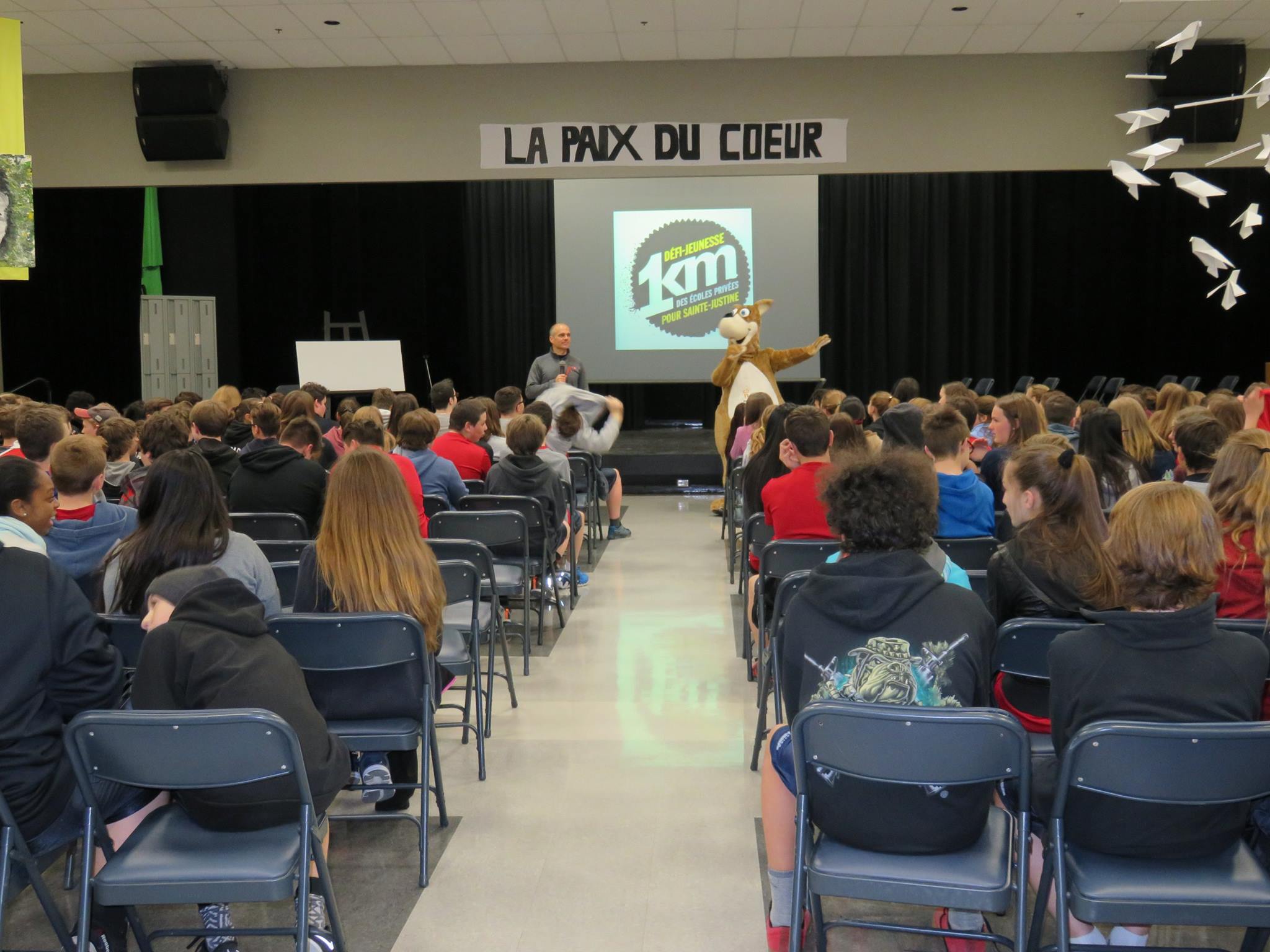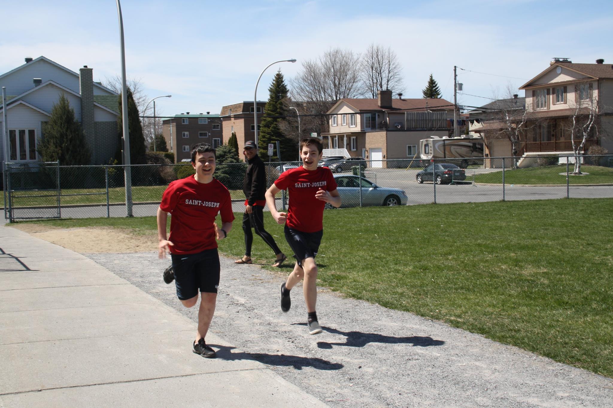 C’est le vendredi 29 avril qu’avait lieu la réalisation du Défi 1 km dans le cadre de la levée de fonds de l’hôpital Ste-Justine. En cette journée ensoleillée où tous les élèves de l’École étaient invités à prendre part à une course non chronométrée sur une distance de 1 kilomètres dans les rues avoisinantes, nous avons tous pu prendre conscience de la chance et du privilège qui nous sont accordés de pouvoir bénéficier d’une bonne santé. Accompagnés et entourés des enseignants, des membres du personnel, de Cachou, la mascotte officielle de l’événement, et de notre invité spécial, M. François Bourdeau, les élèves de tous les niveaux ont pu célébrer après avoir amassé un montant total de $6108,25 pour cette noble cause qui vient en aide aux enfants malades. C’est aussi sous un soleil radieux et baignés par la chaleur des sourires que nous nous sommes rassemblés autour de ce magnifique projet sportif et humanitaire porteur de sens.