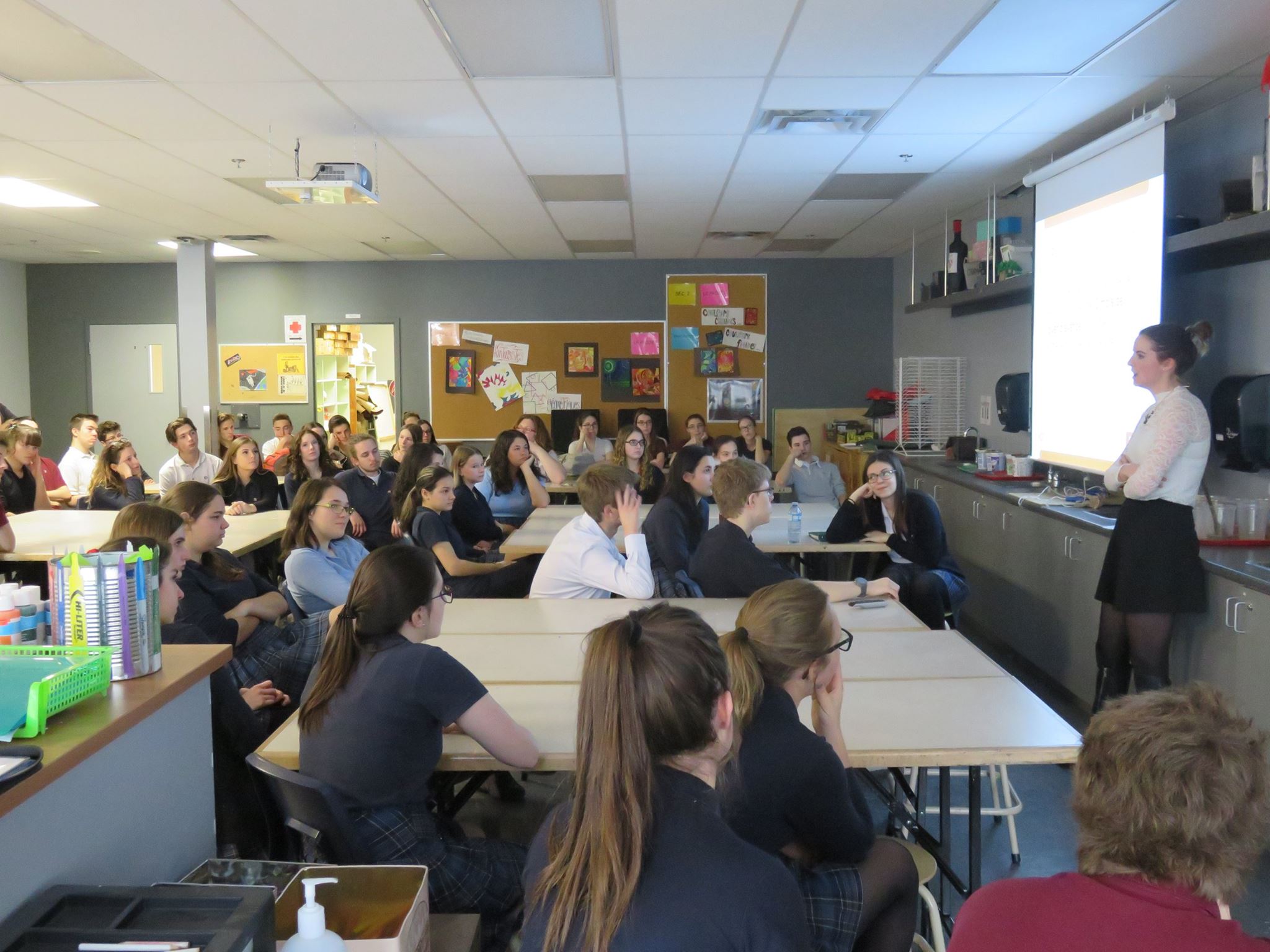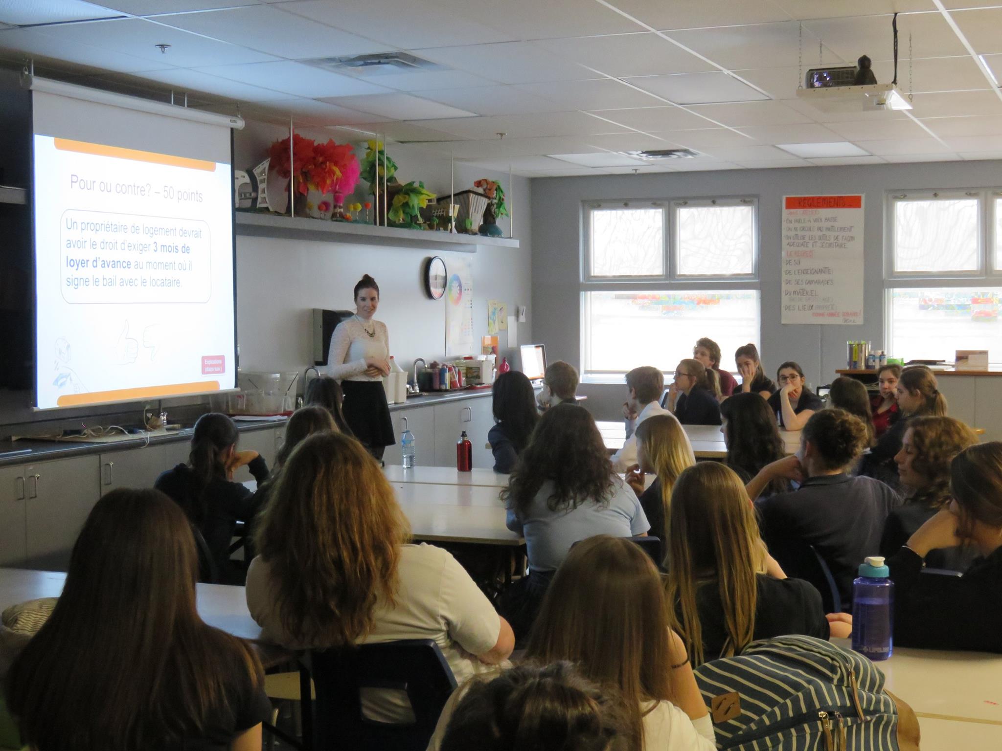 Dans le cadre du cours d’option d’Éducation économique, maître Anne-Sophie Tétreault, notaire de la grande région de Saint-Hyacinthe, est venue présenter sa profession aux élèves de 5e secondaire La conférence de madame Tétreault fait partie des conférences chapeautées par Éducaloi, un organisme québécois qui vise à améliorer l’accès à la justice et au monde du droit. Sans contredit, les élèves ont eu droit à une présentation dynamique, empreinte de rigueur et d’ouverture. Maître Tétreault a su attirer l’attention des jeunes en présentant des mises en situation juridiques qui les touchent, en leur demandant de se prononcer sur l’aspect légal (ou non) pour chacun de ces cas. Une activité très enrichissante … et remplie de surprises !