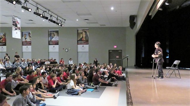 Dans le cadre de la semaine de prévention du suicide, les élèves de 1re secondaire ont eu le privilège d’assister à la conférence de M. Lucas Patuelli, alias Lazylegz.  Témoignage vivant de courage et de persévérance, Lazylegz a su captiver l’intérêt des jeunes par le récit de sa vie et par sa passion pour le breakdance.