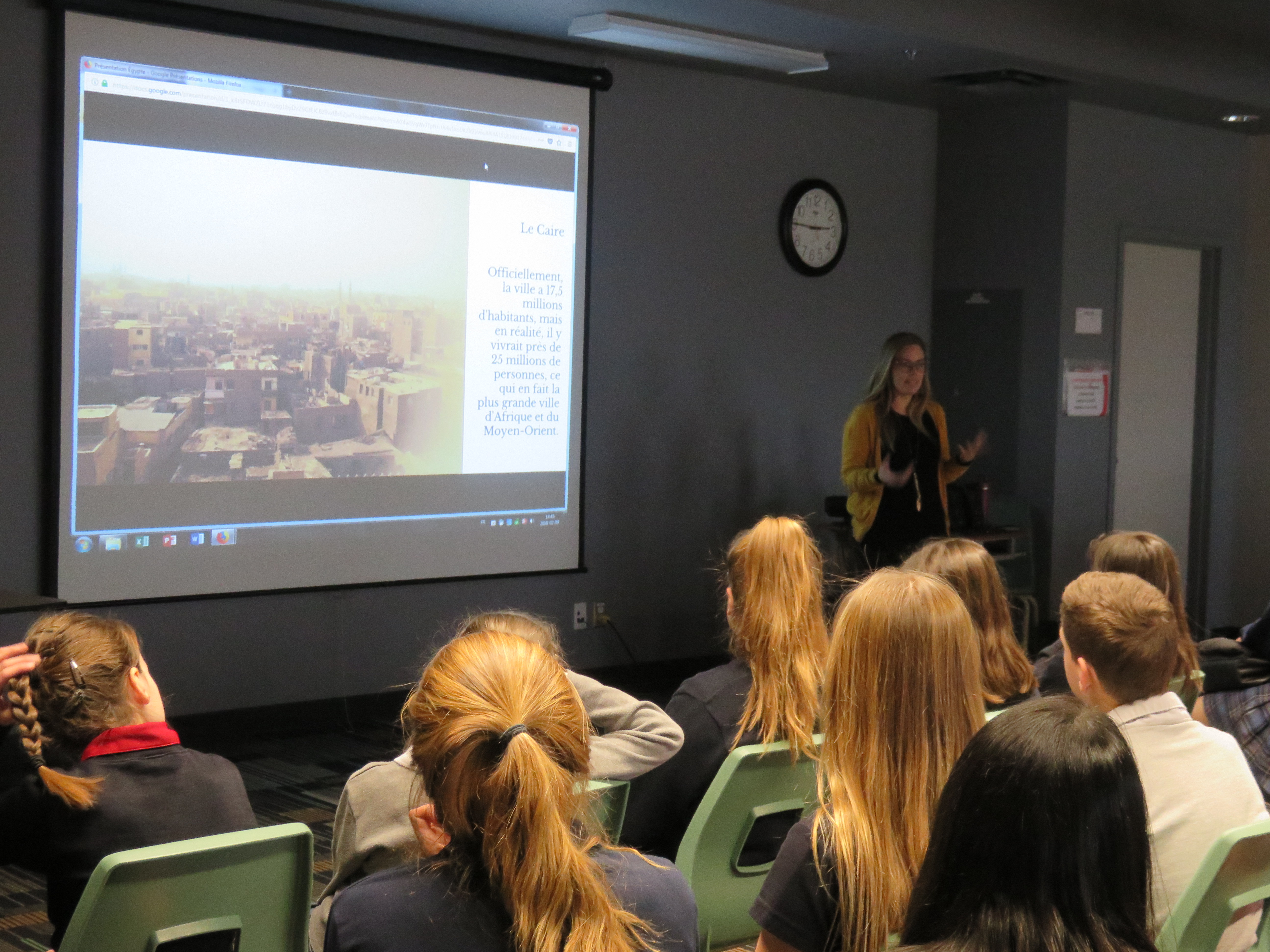 Dans le cadre de l’étude de l’aire culturelle arabe en géographie culturelle de 5e secondaire, Madame Diana Morin, ancienne enseignante de l’ÉSSJ, est venue présenter aux élèves son expérience d’enseignement en Égypte de 2013 à 2015. Il a été question des défis que comporte ce type d’aventure, des beautés de ce pays mais surtout de l’immense générosité des gens qu’elle y a rencontrés. Dans un mélange liant curiosité, ouverture et humilité, Diana Morin nous a permis de partager une partie de sa vie et nous fait voir l’importance de suivre son instinct.