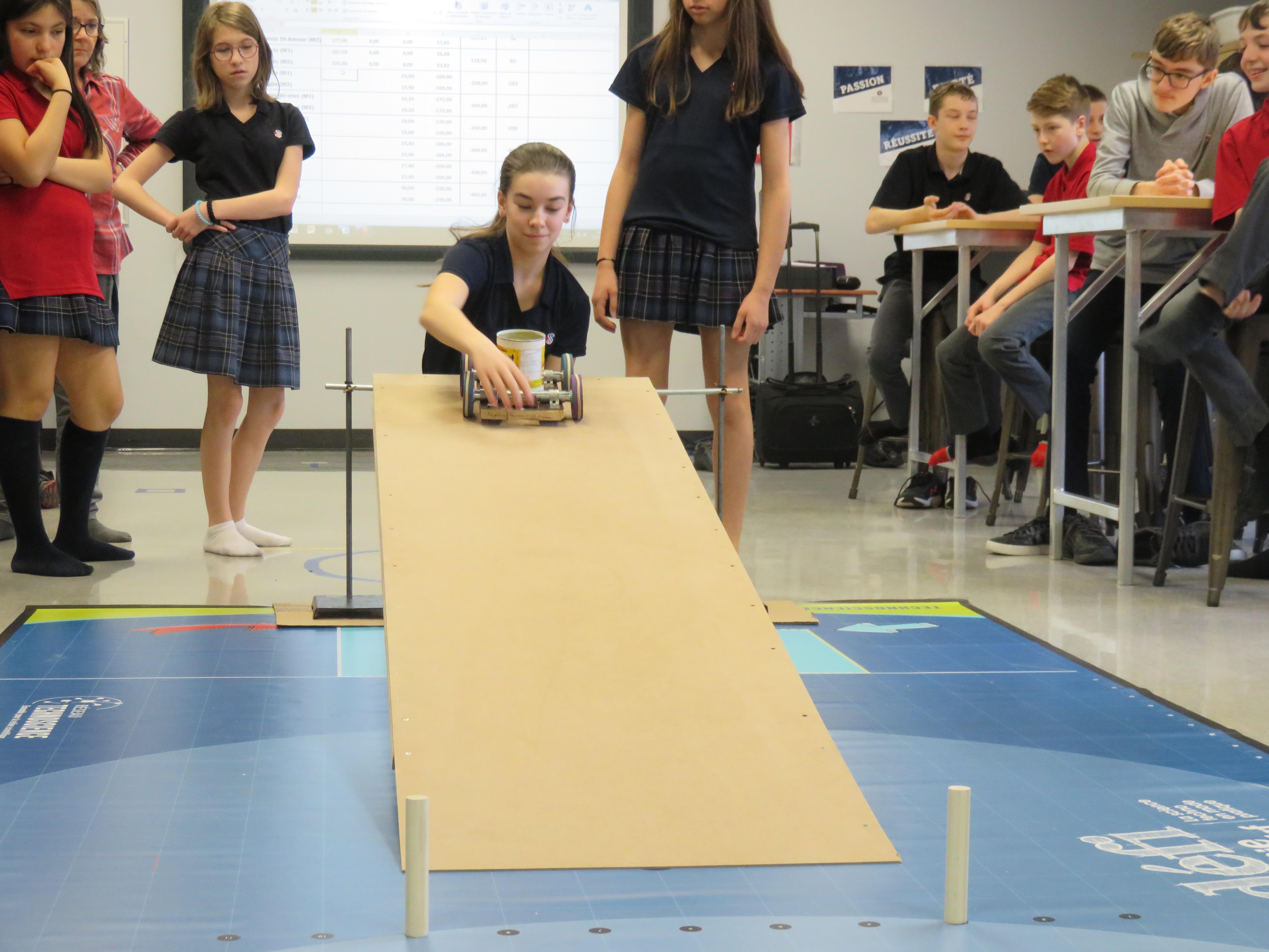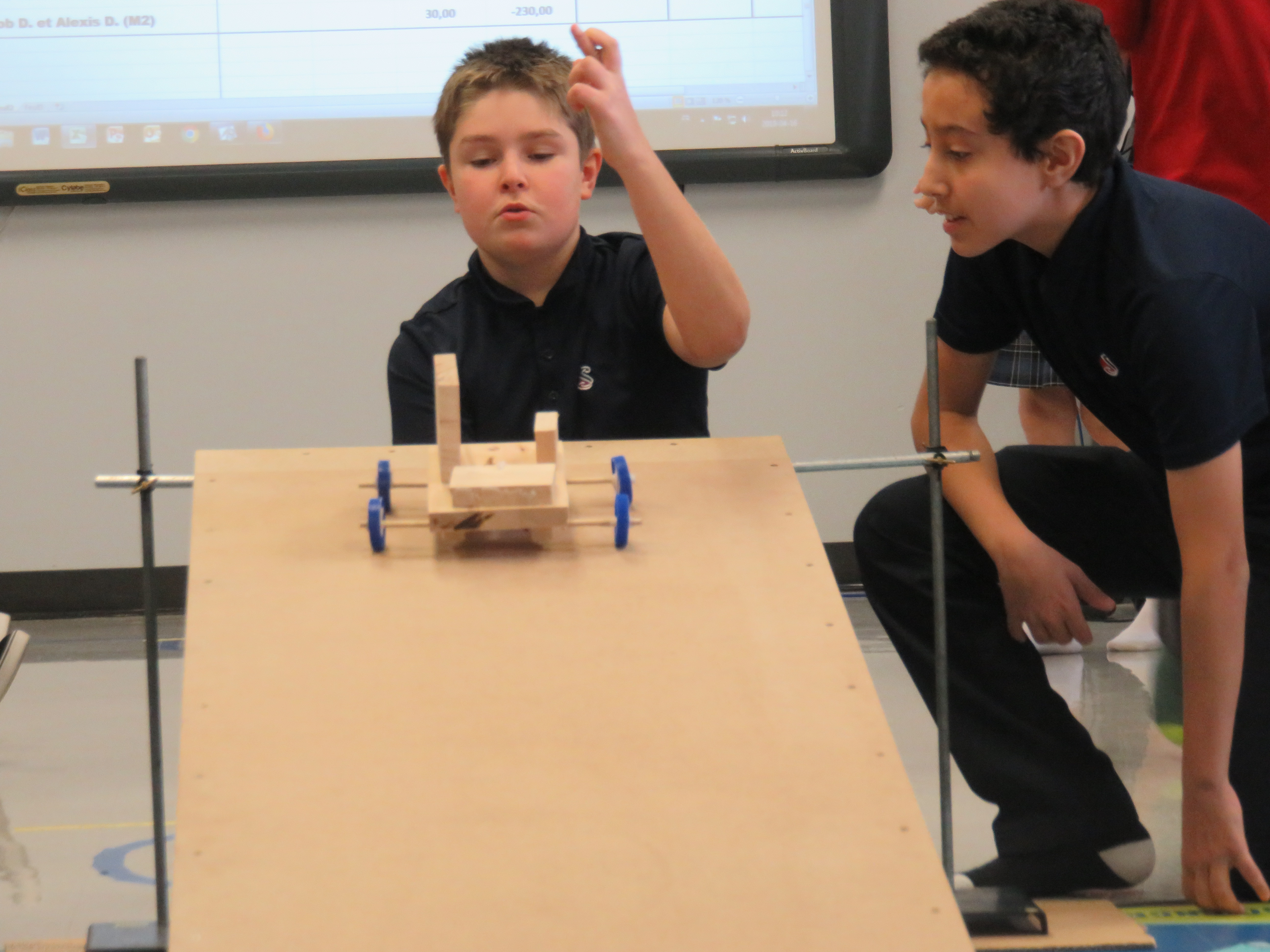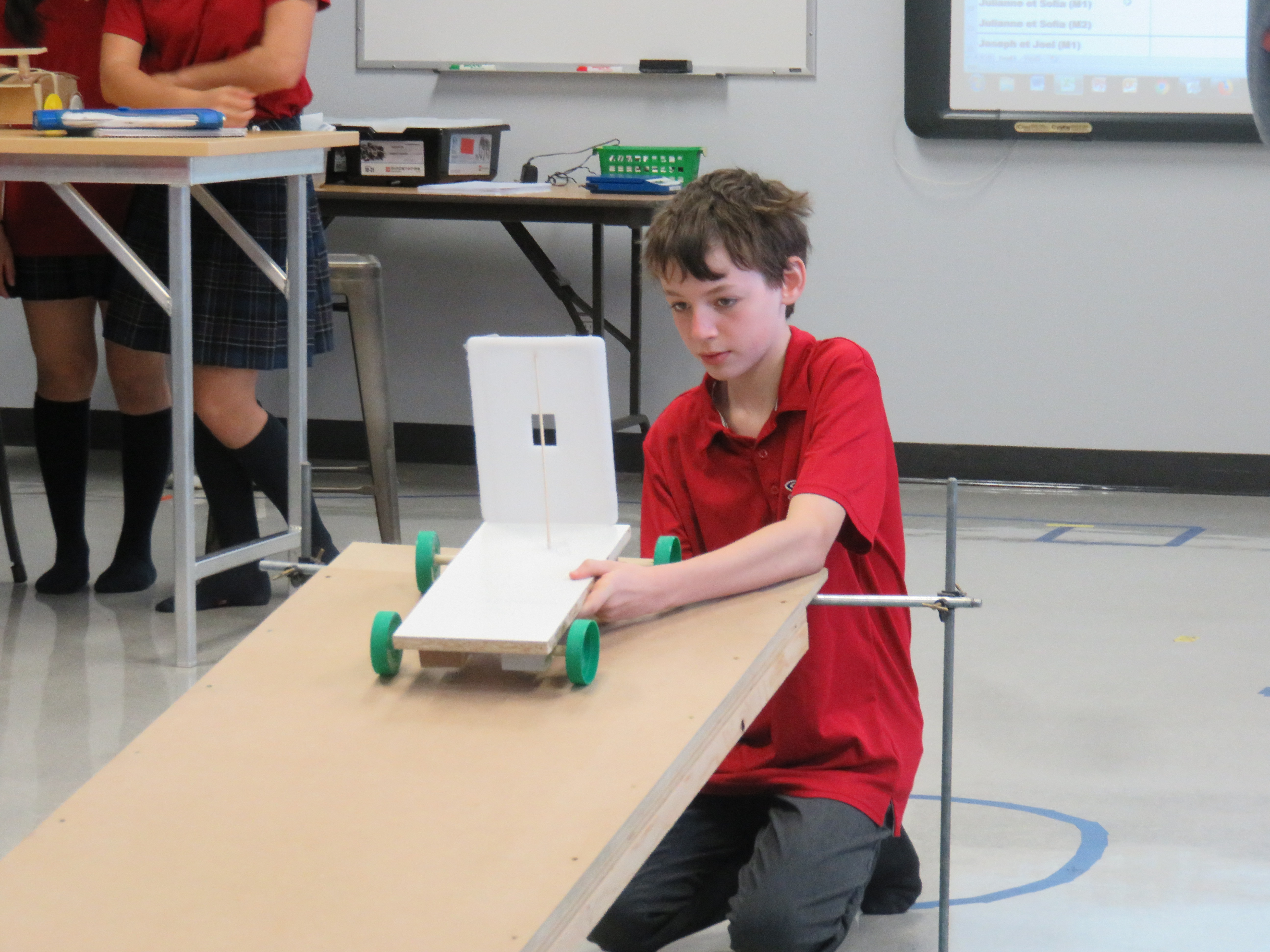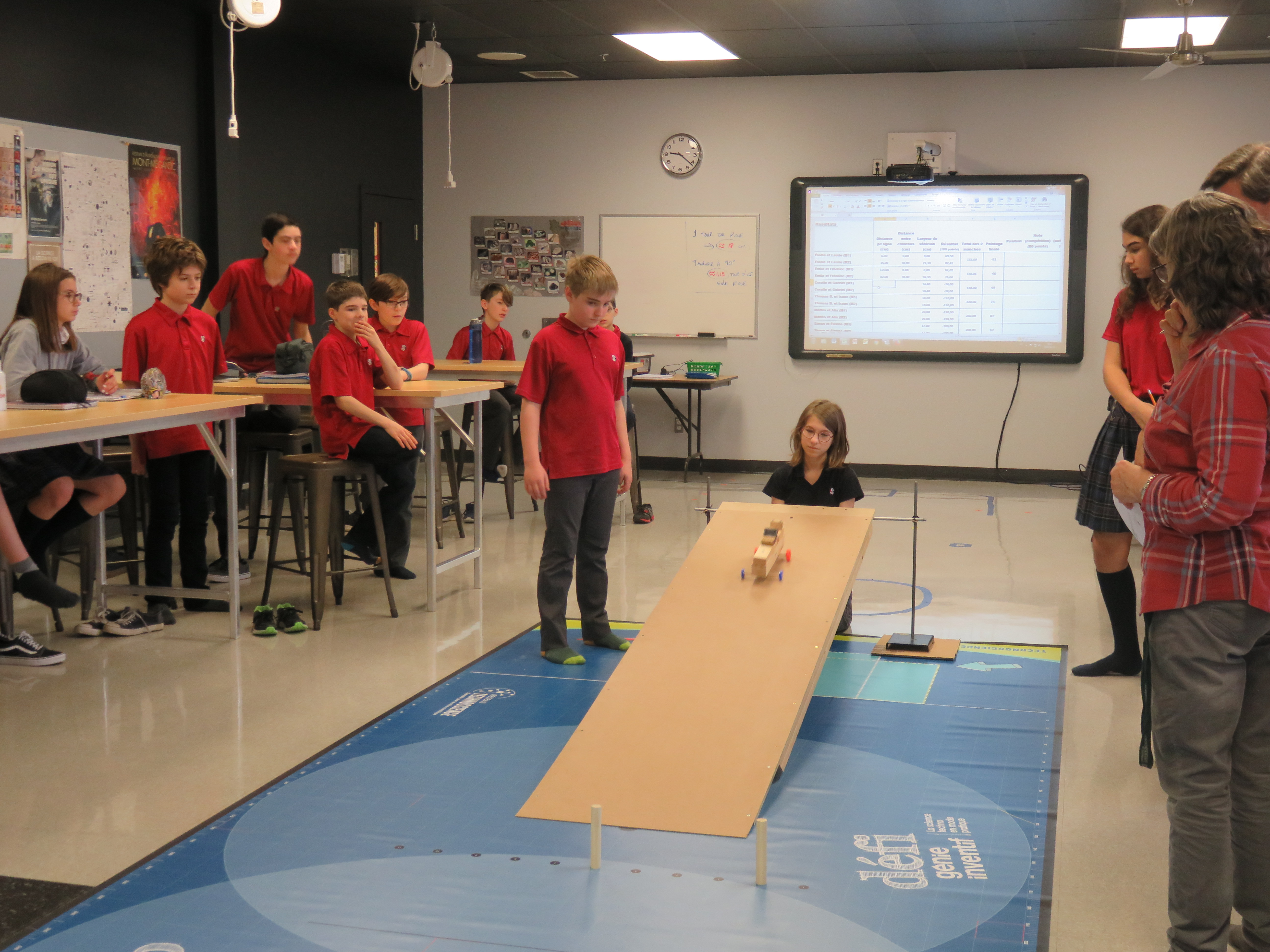 Dans le cadre du cours de multisciences (1re secondaire), les élèves ont relevé avec brio le Défi Génies Inventifs: « Freine tes ardeurs! »  Ils devaient construire un bolide, à partir de matériaux recyclés, capable de; dévaler un plan incliné; passer le plus près possible entre deux colonnes et s’arrêter le plus près possible d’une ligne prédéterminée.  Le plaisir et les sourires furent au rendez-vous lors de la compétition le 16 avril dernier.  Bravo à tous et à toutes!