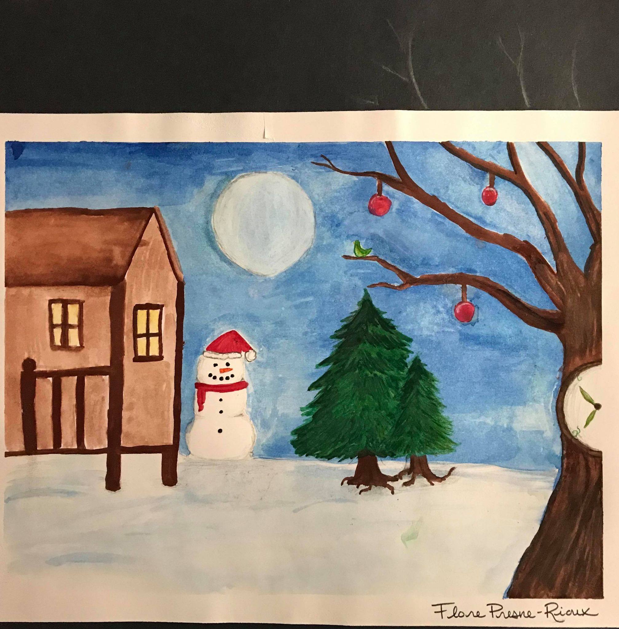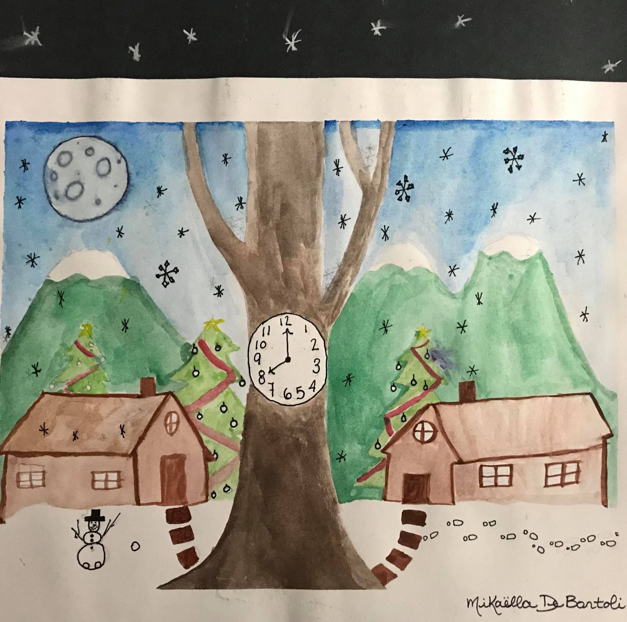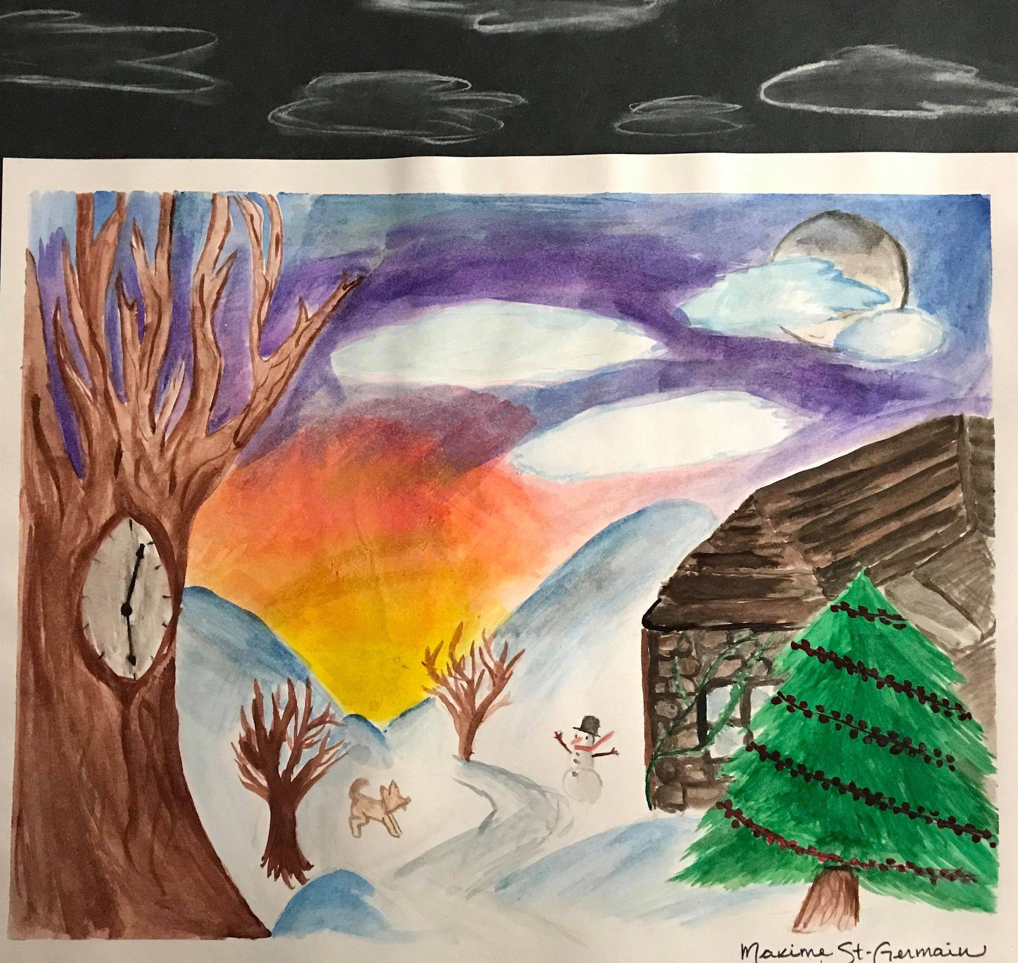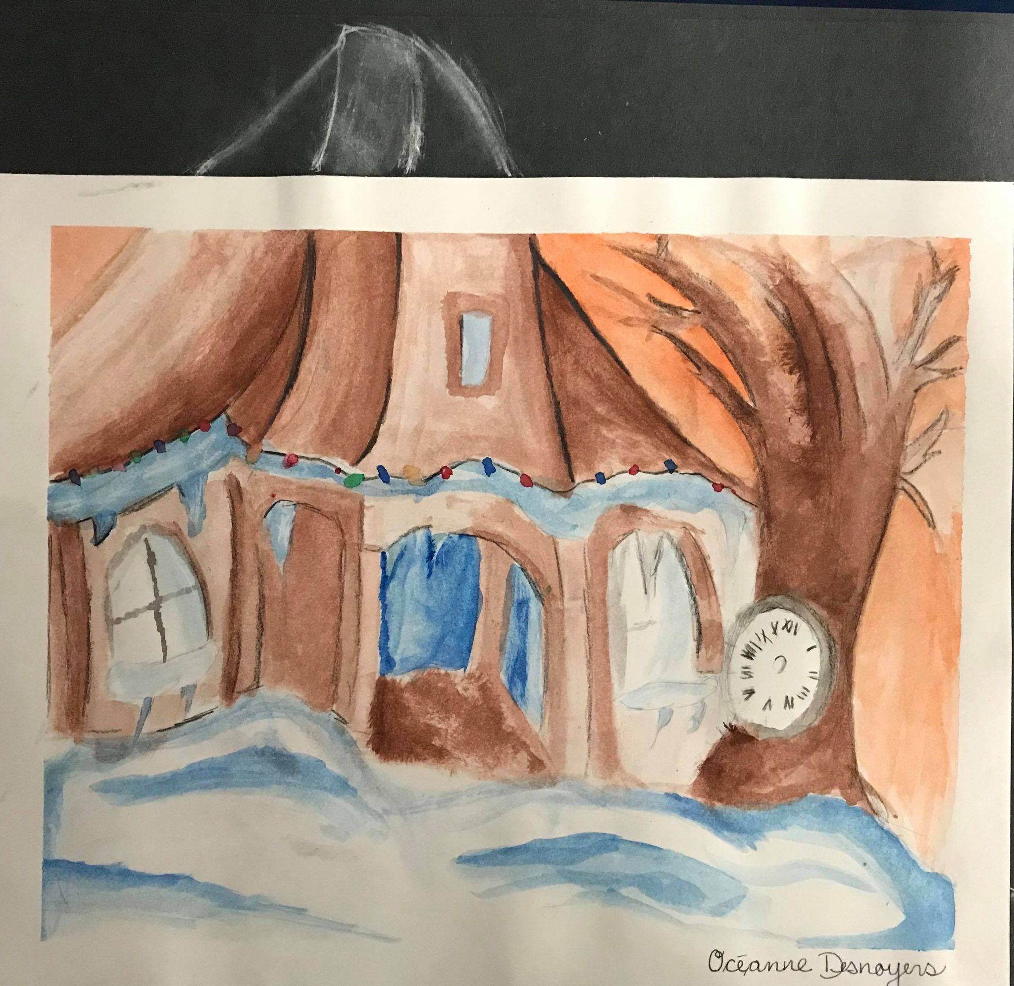 Suite au visionnement du film québécois Babine, les élèves devaient représenter un paysage hivernal s’inspirant de l’univers visuel du film. Ils devaient aussi introduire le fameux « arbre à horloge » dans leur aquarelle. Les projets seront exposés lors de l’exposition de Noël dans la cafétéria Moreau.