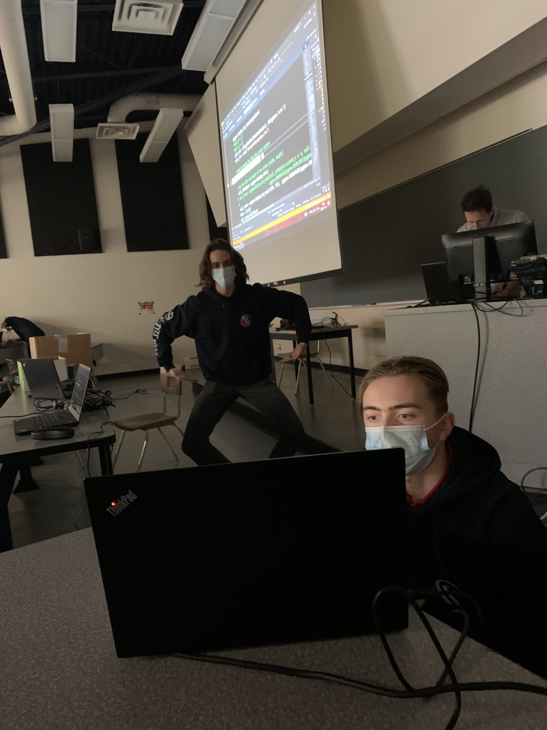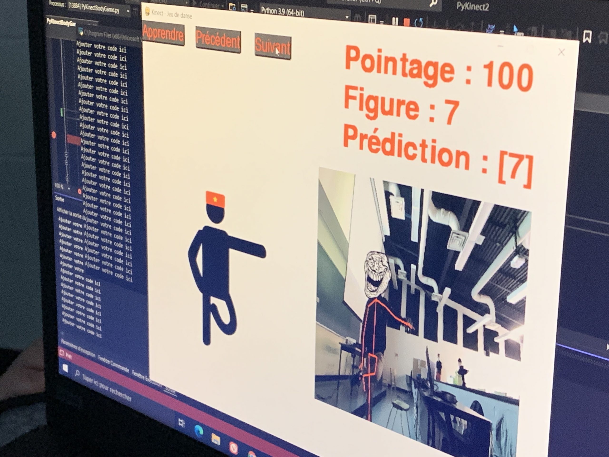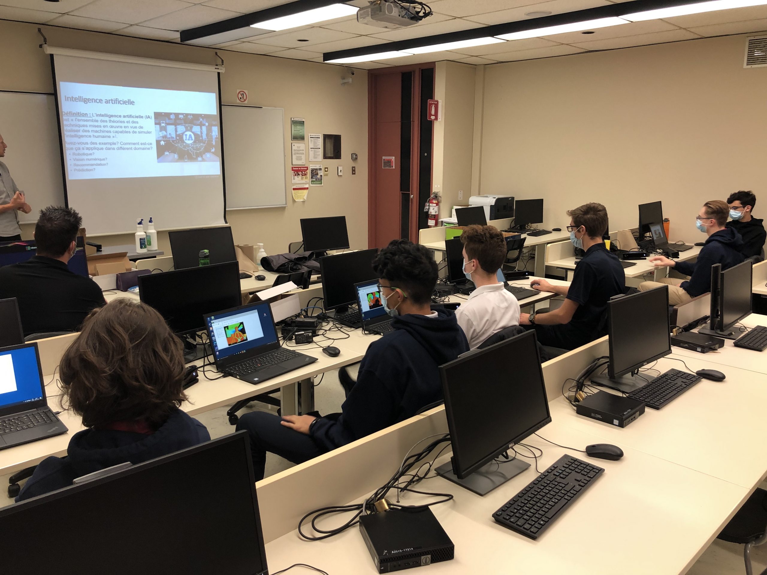 Le 16 novembre dernier, notre escouade de jeunes apprentis en intelligence artificielle (IA) a été invitée par le Cégep de Saint-Hyacinthe à participer à une journée de formation.  Lors de cette activité, nos élèves ont eu la chance d’en apprendre davantage sur le langage Python et sur la reconnaissance d’images à l’aide d’une console « Kinect ».  Cette journée s’est déroulée sous la supervision d’Hugo St-Louis, un enseignant d’informatique du cégep.  Cette collaboration a permis à nos élèves de développer une petite application IA capable de capter et catégoriser certains mouvements du corps pour ensuite les appliquer dans un jeu ludique.  Une belle journée enrichissante et stimulante!