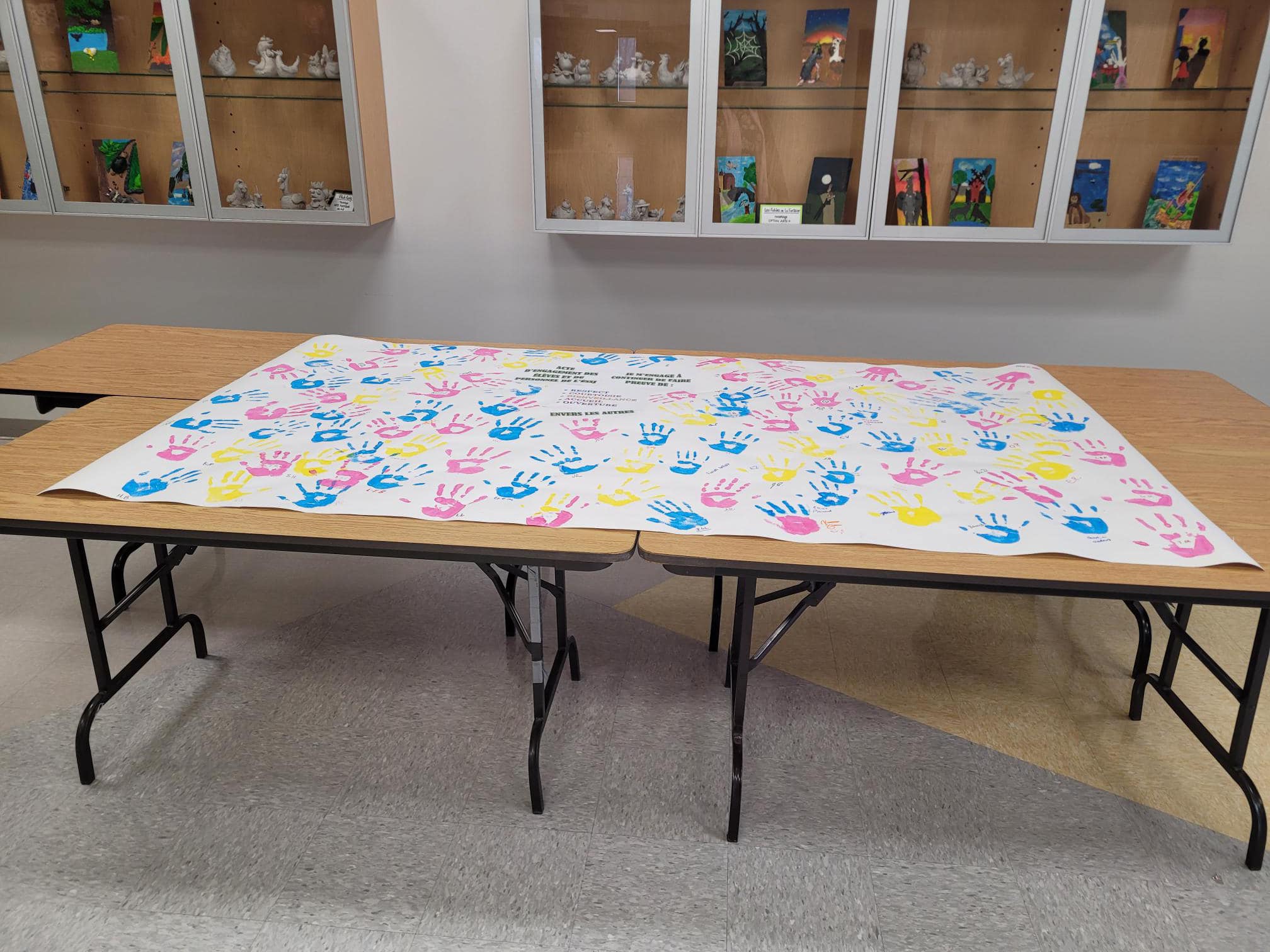 Aux heures des dîners, une table a été installée dans le hall de la bibliothèque avec une banderole d’engagement. Plusieurs élèves et membres du personnel ont signé l’acte d’engagement de continuer à faire preuve de respect, courtoisie, bienveillance et ouverture avec une main peinte pour ceux et celles qui le souhaitent pour exprimer leur solidarité envers les personnes victimes de toute forme de discrimination.