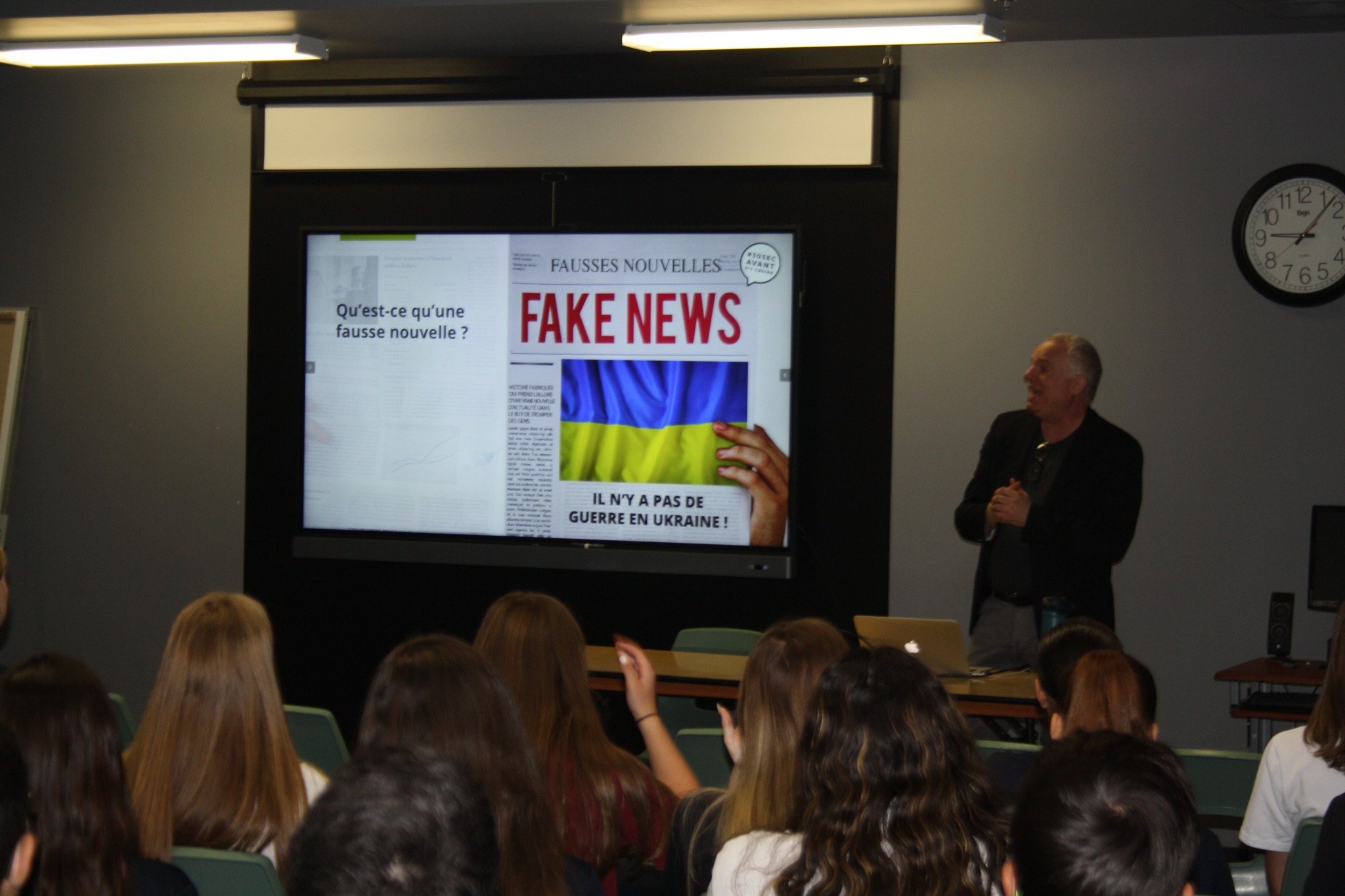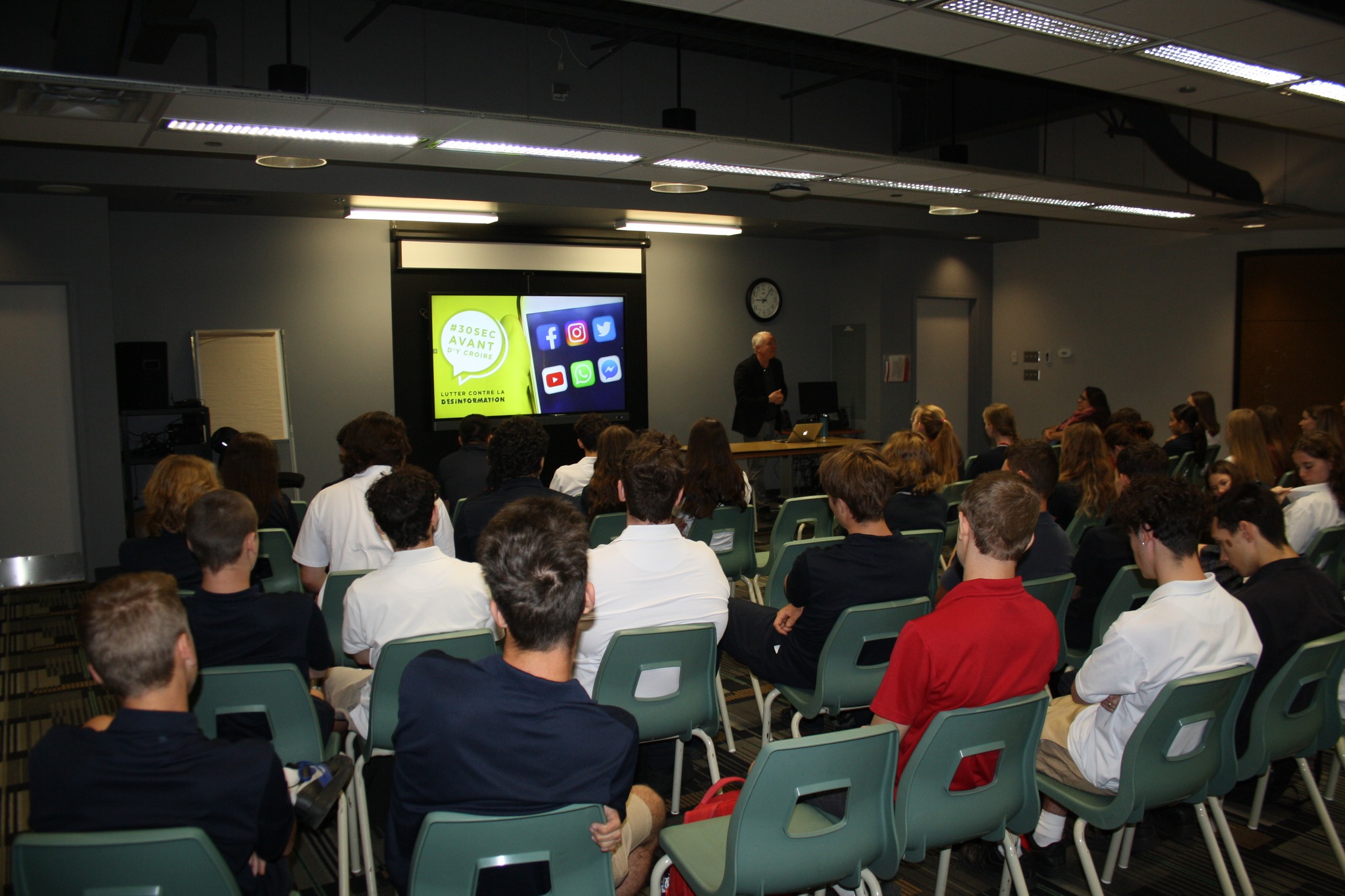 Mercredi 27 septembre dernier, les élèves des groupes 51 à 55 ont eu le privilège d’accueillir le journaliste M. André Lavoie, dans le cadre du cours de Monde contemporain (chapitre les médias). Critique pigiste en cinéma au Devoir depuis 1998 et détenteur d’une maîtrise en études cinématographiques, il collabore aussi à différents magazines comme Sélection du Reader’s Digest ainsi que diverses émissions de Radio-Canada. Dans le cadre des conférences intitulées #30 secondes avant d’y croire, en partenariat avec le CQEMI (Centre québécois d’éducation aux médias et à l’information) M. Lavoie a présenté aux élèves le phénomène des fausses nouvelles, de la désinformation, mais surtout comment se préparer avant de croire quelque chose sur les réseaux sociaux et de le partager. Accessible, dynamique et persistant, M. André Lavoie nous a permis de nous préparer à être de meilleurs citoyens et mieux informés.