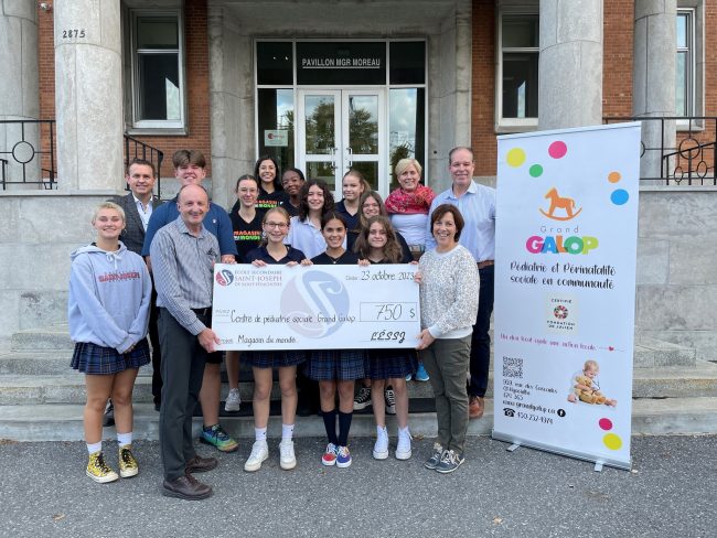 Le 18 octobre dernier, les élèves du Magasin du monde de l’année 2023-2024 ont remis un montant de 750$ à l’organisme Grand Galop. Des représentants de l’organisme ont présenté les besoins et leurs actions dans la communauté. Un beau moment d’échange pour nos élèves qui en plus de faire la promotion du commerce équitable, d’apprendre comment fonctionne une entreprise d’économie sociale, ils remettent de l’argent à leur communauté.