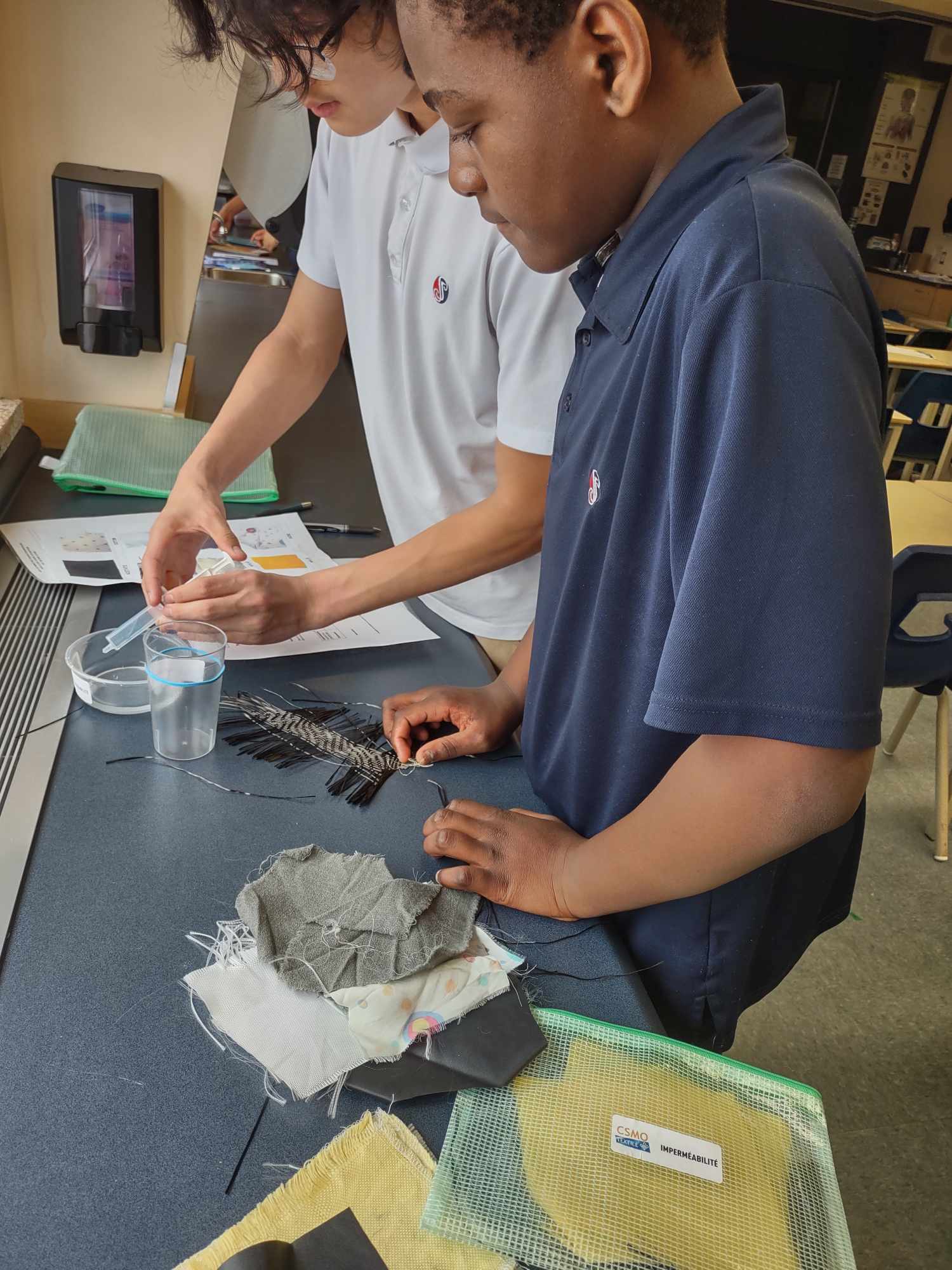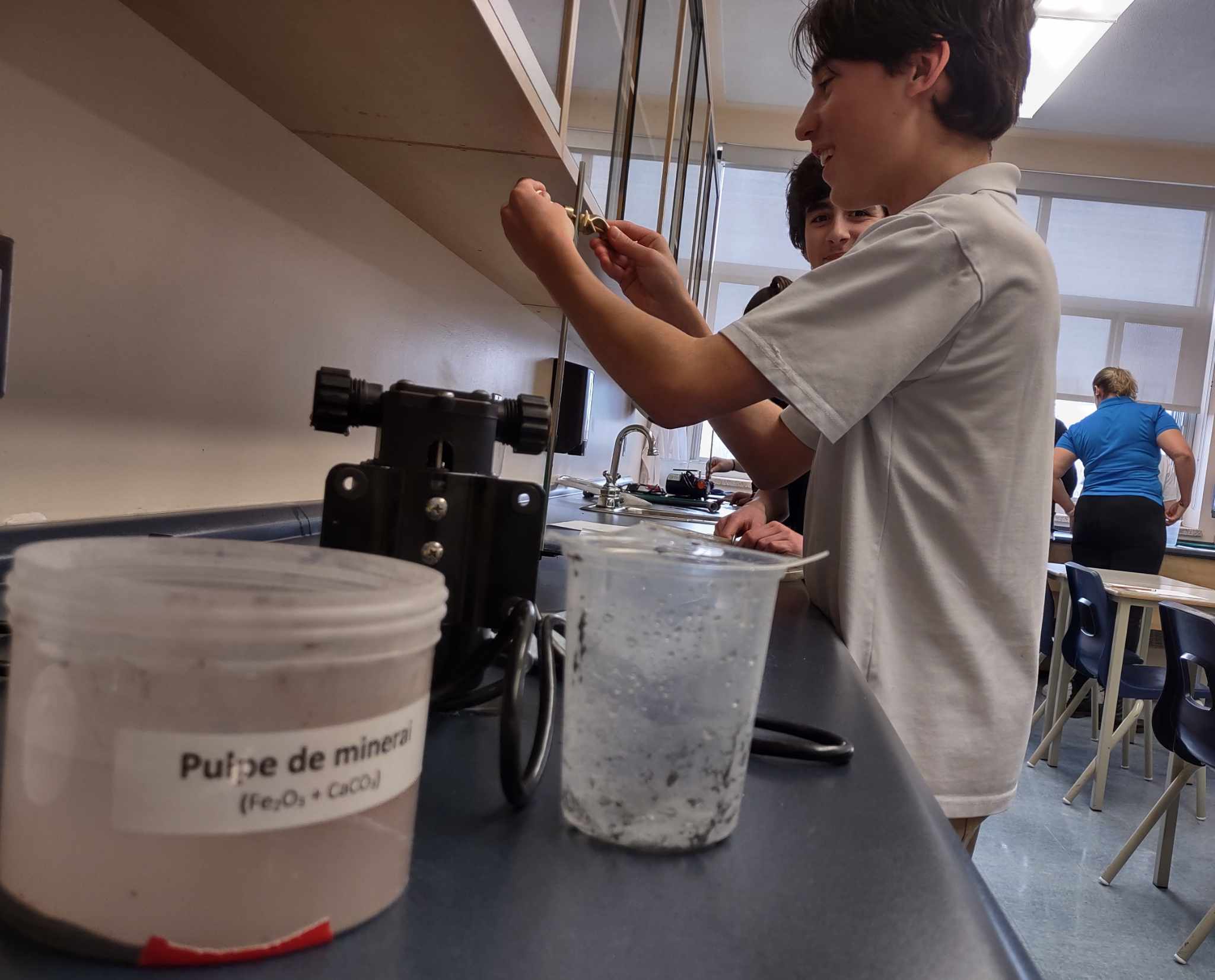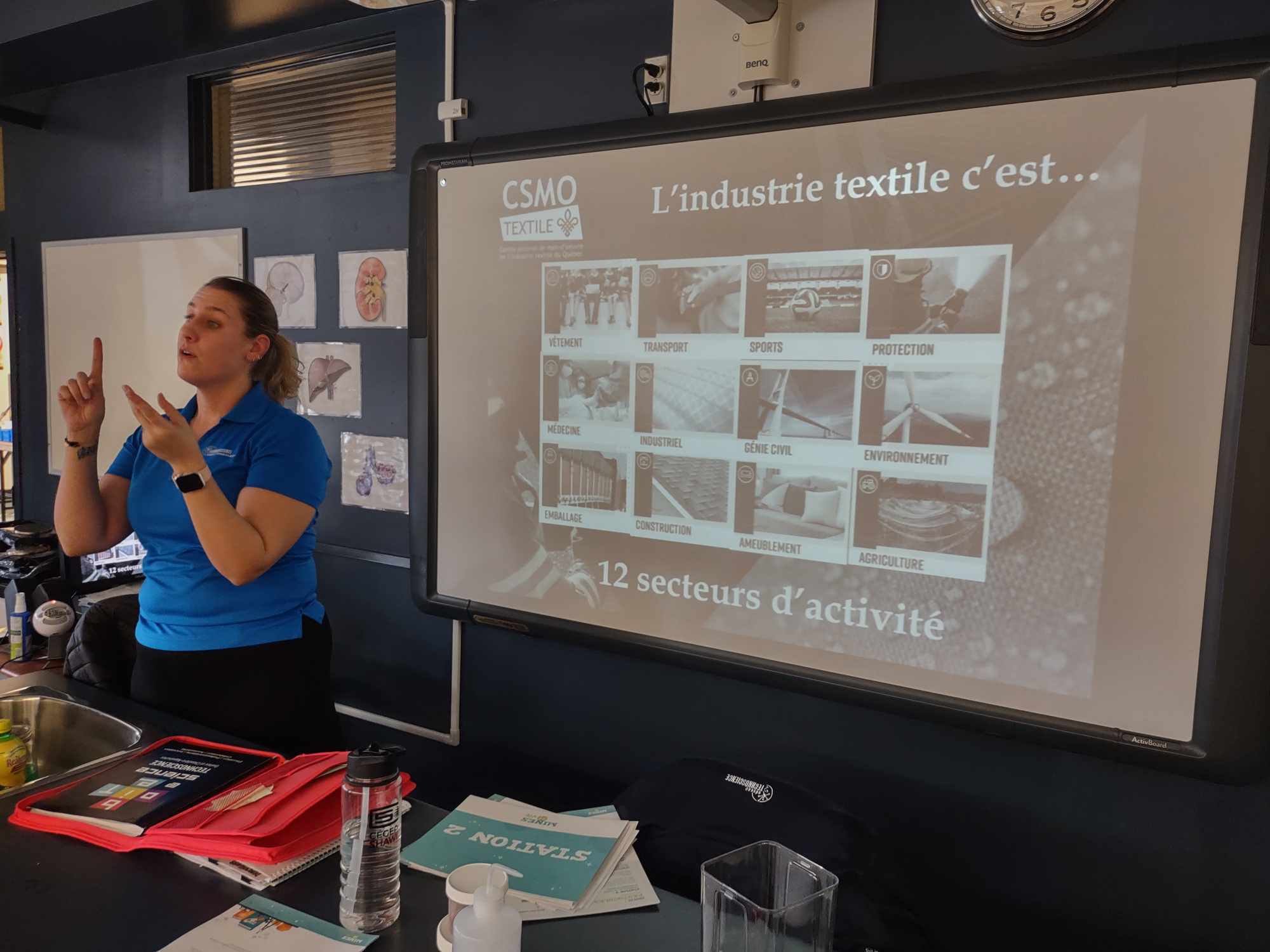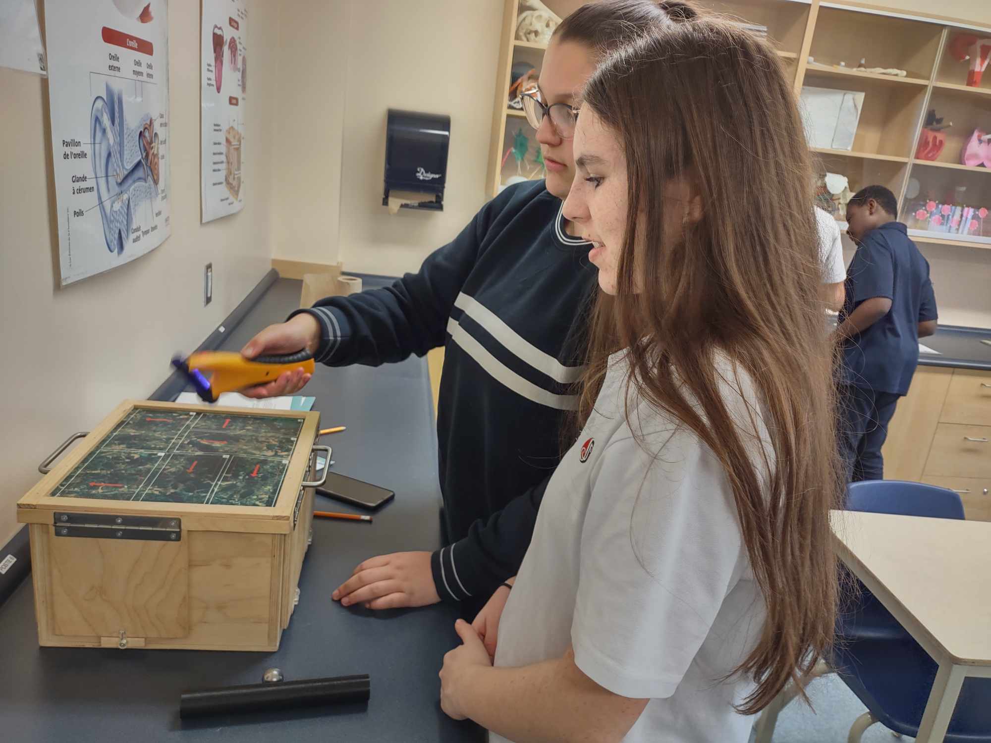 Ateliers Technoscience Mauricie Centre-du-Québec avec l’intéressante Adeline. Au programme de cet après-midi dans le cours d’option multisciences de 3e secondaire : laboratoires de prospection minière et tests de propriétés textiles.