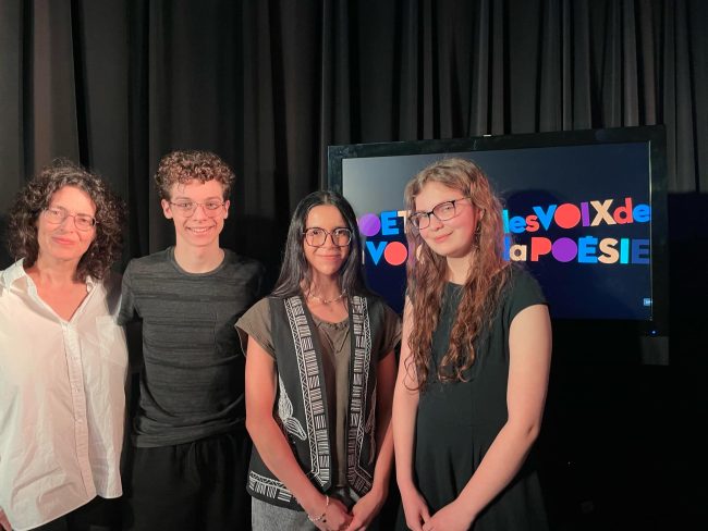 Belle première expérience au concours de récitation régionale en équipe des Voix de la Poésie pour Tristan Ayala Seyer, Luna Gabriela Rojas Gonzalez et Marie-Maude Morin du PEI!