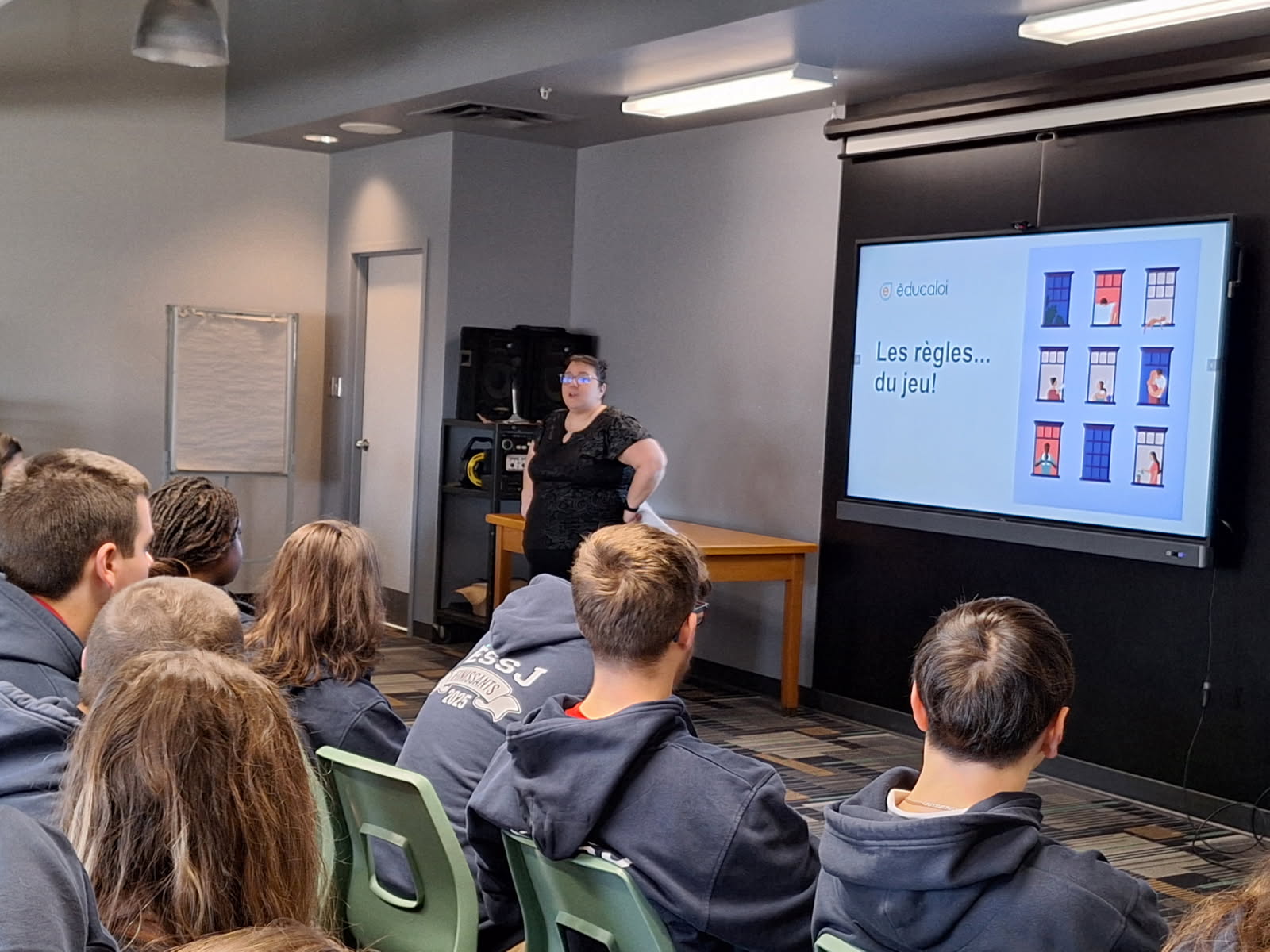 Pendant une heure, elle nous a présenté les organismes au Québec liés au monde juridique, mais surtout ce que la loi prévoit dans certaines situations qui peuvent toucher le quotidien d’un jeune de 5e secondaire, par exemple en droit criminel, en droit du travail, en droit des consommateurs, en droit du logement et sur le consentement sexuel.