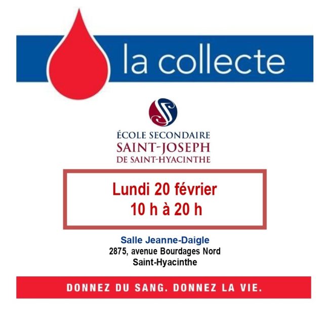 Notre traditionnelle collecte de sang est de retour. Prenez votre rendez-vous dès maintenant sur le lien suivant http://www.hema-quebec.qc.ca/trois-facons-simples.fr.html ! Grâce à votre don de sang, jusqu'à 4 personnes pourront retrouver la santé. Le 20 février, on vous attend !