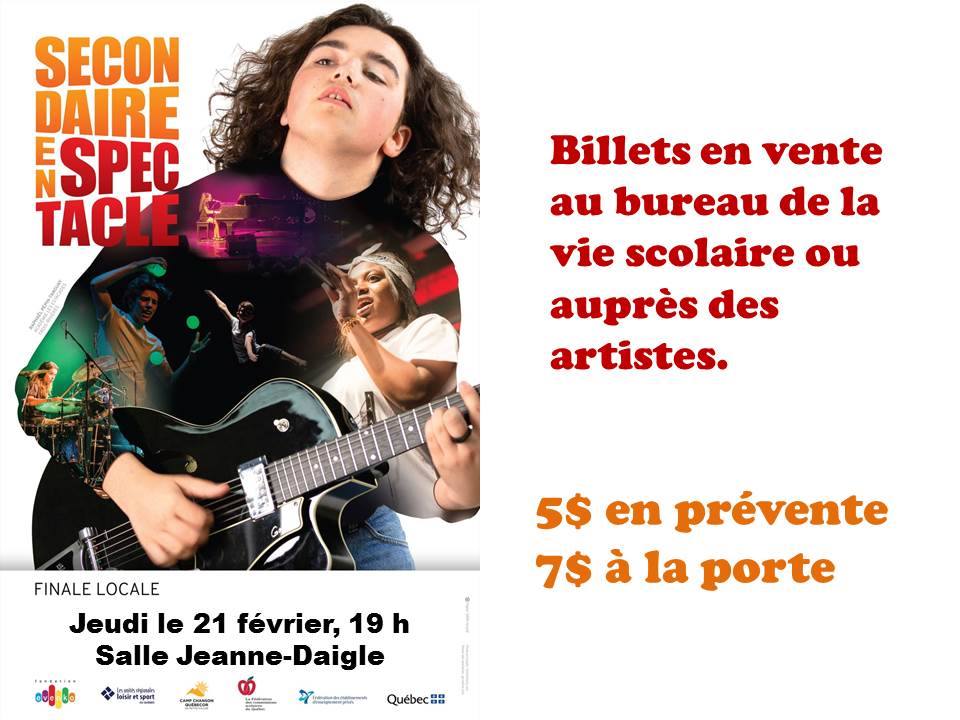 Nous vous invitons à Secondaire en spectacle, le jeudi 21 février prochain. Une magnifique soirée vous attend! Procurez-vous vos billets rapidement!