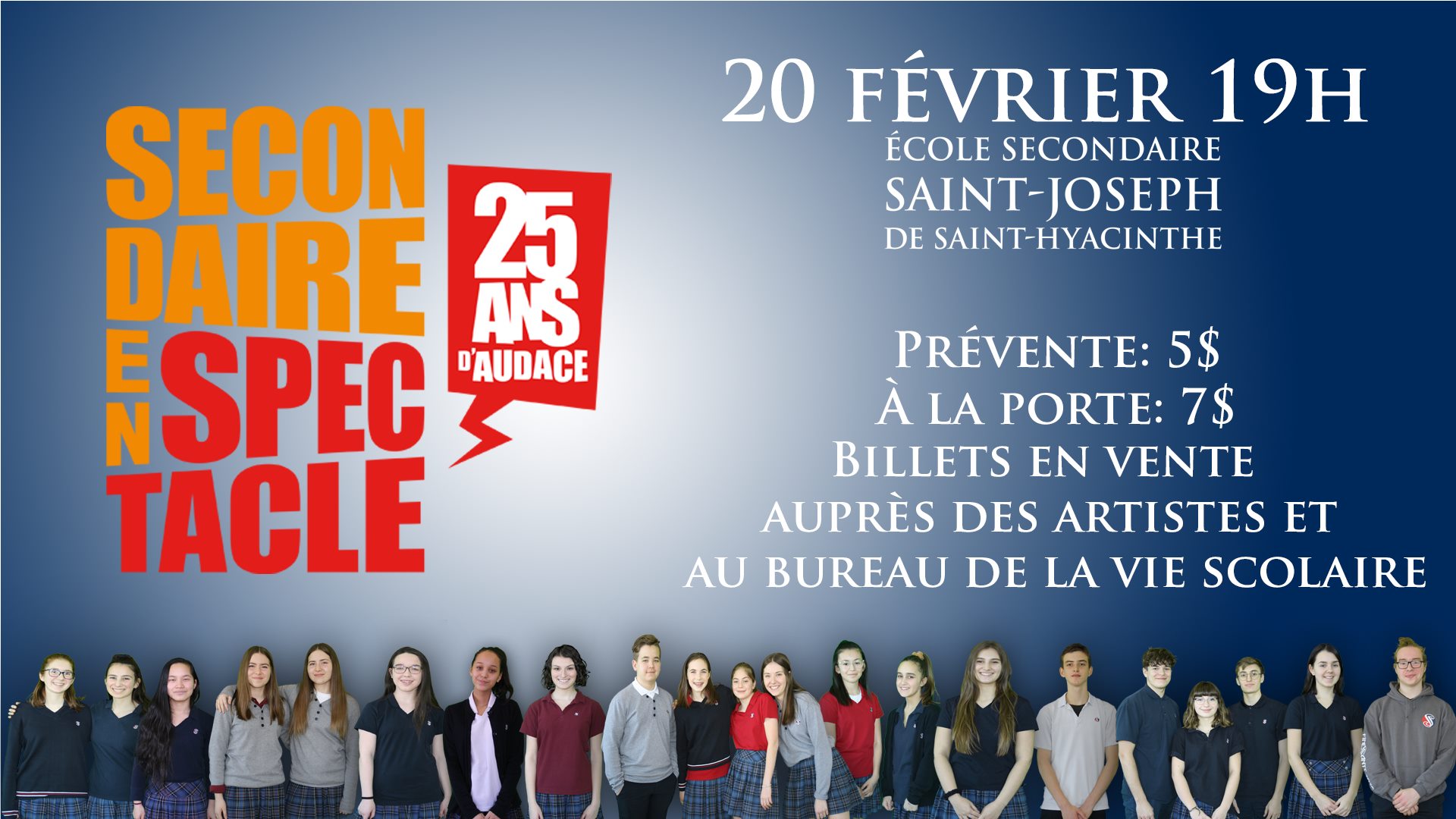 Le 20 février prochain, une vingtaine d'élèves se produiront sur scène dans le cadre de « Secondaire en spectacle ». Chant, danse, musique et numéro de cirque seront au menu de cette belle soirée! N'attendez pas et achetez votre billet pour passer une magnifique soirée! Ils sont en vente auprès des artistes ainsi qu’à l’école, au bureau de la vie scolaire.
