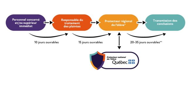 Avant leur transmission, les conclusions sont cependant examinées par le Protecteur national de l’élève, qui dispose pour sa part d’un délai maximal de 5 jours ouvrables pour décider d’examiner lui-même la plainte. Dans cette éventualité, il dispose alors de 10 jours ouvrables pour en terminer l’examen et substituer, au besoin, ses conclusions ou ses recommandations à celles du protecteur régional de l’élève.